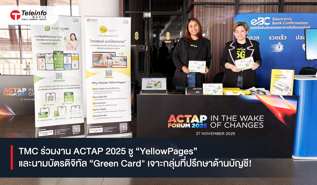 News, ข่าวและกิจกรรม 01 ธันวาคม 2025TMC ร่วมงาน ACTAP 2025 ชู “YellowPages” และนามบัตรดิจิทัล “Green Card” เจาะกลุ่มที่ปรึกษาด้านบัญชี!TMC Webmaster https://www.teleinfomedia.co.th/wp-content/uploads/2025/12/cover-event-actap-1200x700px.jpg 700 1200 TMC Webmaster https://www.teleinfomedia.co.th/wp-content/uploads/2022/06/logo-TMC-300x150-1.png TMC Webmaster2025-12-01 10:49:412025-12-01 11:12:09TMC ร่วมงาน ACTAP 2025 ชู “YellowPages” และนามบัตรดิจิทัล “Green Card” เจาะกลุ่มที่ปรึกษาด้านบัญชี!